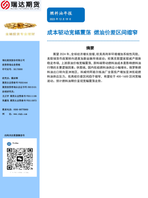 【瑞达期货】【20231220】燃料油年报:成本驱动宽幅震荡 燃油价差区间缩窄-19页 行业研究