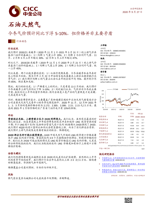 【中金公司】【20200927】石油天然气:今冬气价预计同比下浮5-10%,但价格并非主要矛盾-5页 行业研究