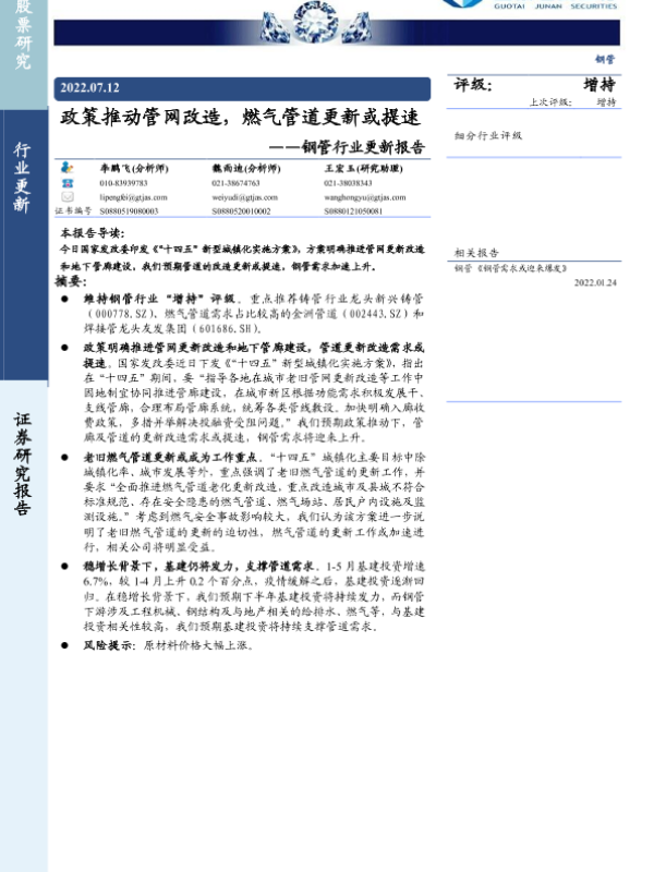 【国泰君安证券】【20220712】20220712-国泰君安-钢管行业更新报告:政策推动管网改造,燃气管道更新或提速-3页 行业研究