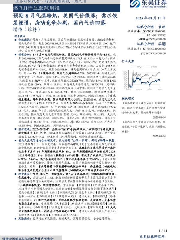 【东吴证券】【20250811】燃气Ⅱ行业跟踪周报:预期8月气温转热,美国气价微涨;需求恢复缓慢,海陆竞争加剧,国内气价回落-14页 证券期货研究报告