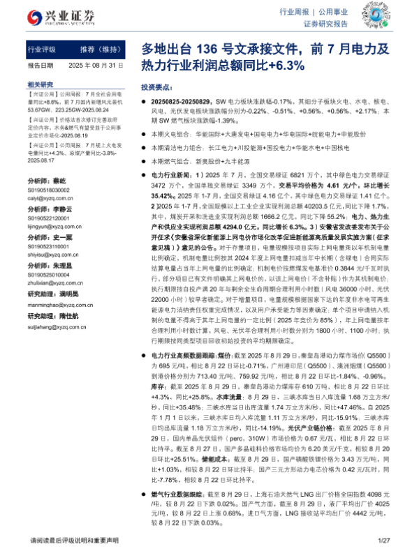 【兴业证券】【202508】公用事业行业周报:多地出台136号文承接文件,前7月电力及热力行业利润总额同比+6.3%-27页 证券期货研究报告