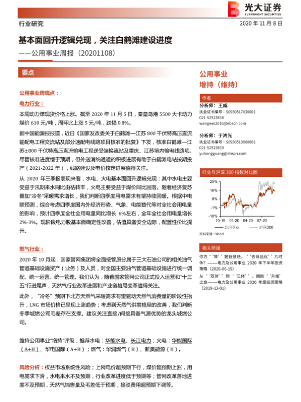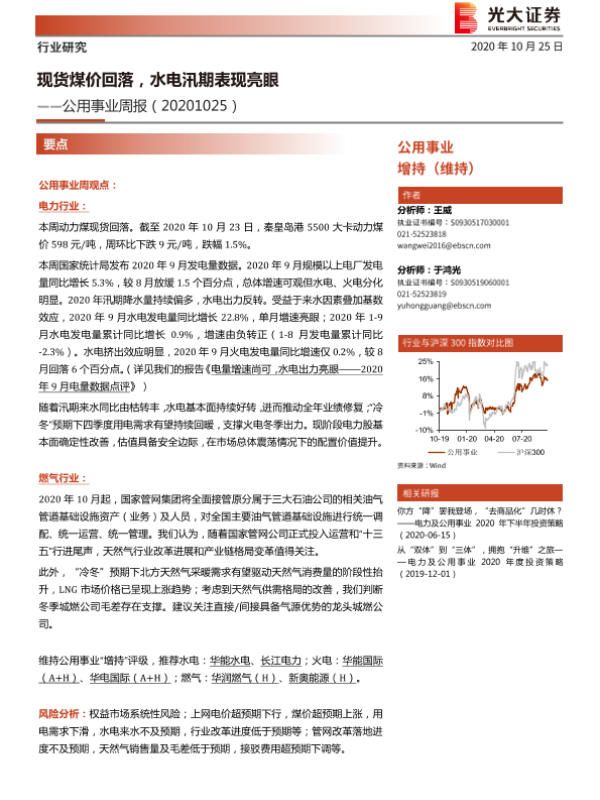 【光大证券】【20201025】公用事业周报:现货煤价回落,水电汛期表现亮眼-9页 行业研究