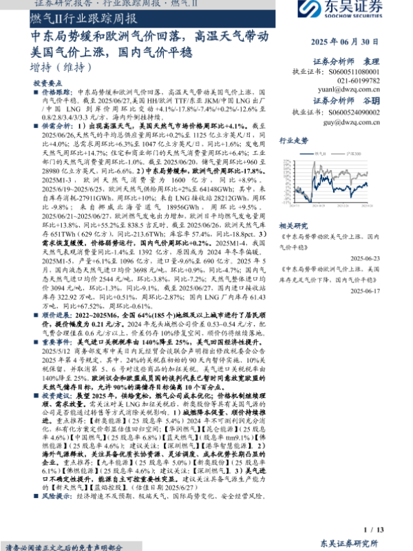 【东吴证券】【20250630】燃气Ⅱ行业跟踪周报:中东局势缓和欧洲气价回落,高温天气带动美国气价上涨,国内气价平稳-13页 证券期货研究报告
