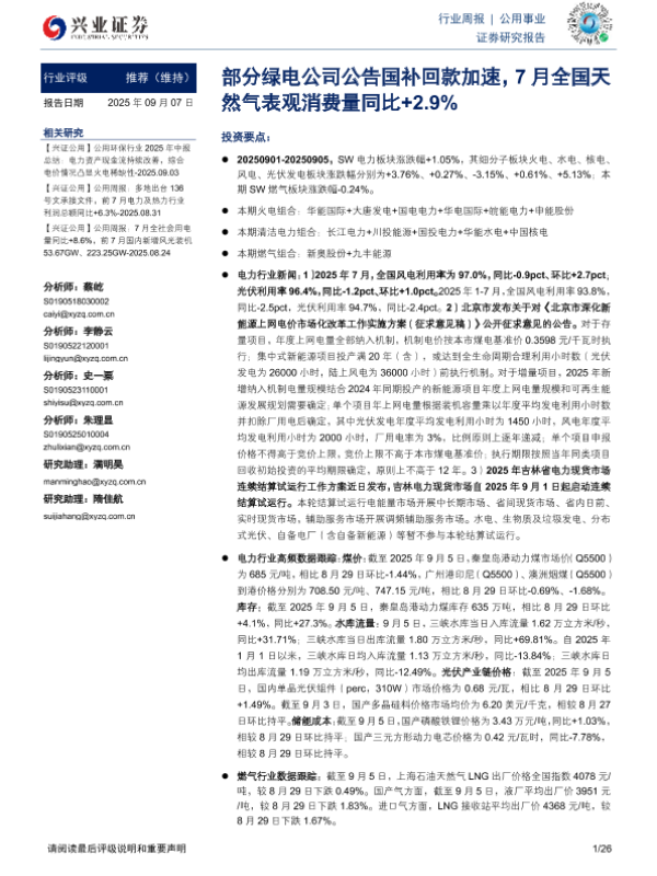 【兴业证券】【202509】公用事业行业周报:部分绿电公司公告国补回款加速,7月全国天然气表观消费量同比+2.9%-26页 证券期货研究报告