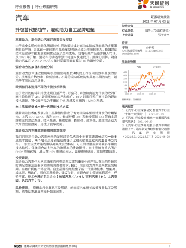 【天风证券】【20210703】汽车:升级替代燃油车,混动助力自主品牌崛起-26页 行业研究