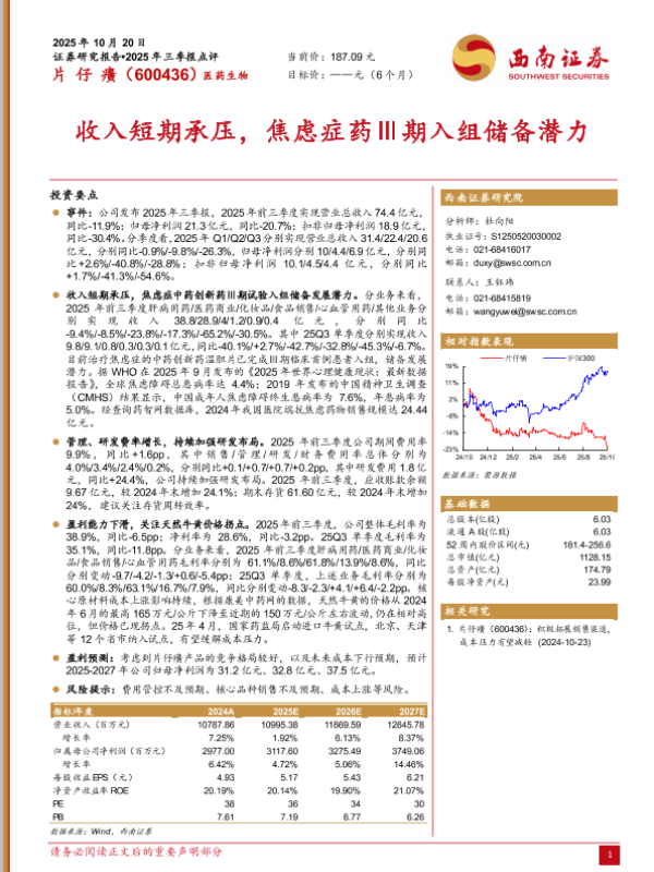 【浙商证券】【202510】片仔癀 2025年三季报点评——业绩短期承压,2025Q4起有望缓慢向好-3页 证券期货研究报告