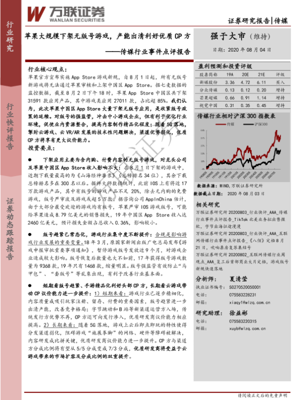 【万联证券】【20200804】苹果大规模下架无版号游戏,产能出清利好优质CP方-4页 行业研究