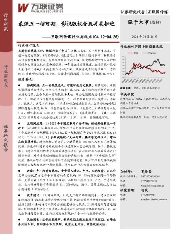【万联证券】【20210425】20210425-万联证券-互联网传媒行业周观点:最强五一档可期,影视版权合规再度推进-18页 行业研究