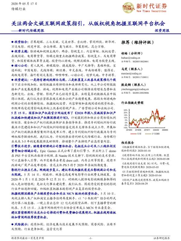 【新时代证券】【20200517】新时代传媒周报:关注两会文娱互联网政策指引,从版权视角把握互联网平台机会-37页 行业研究