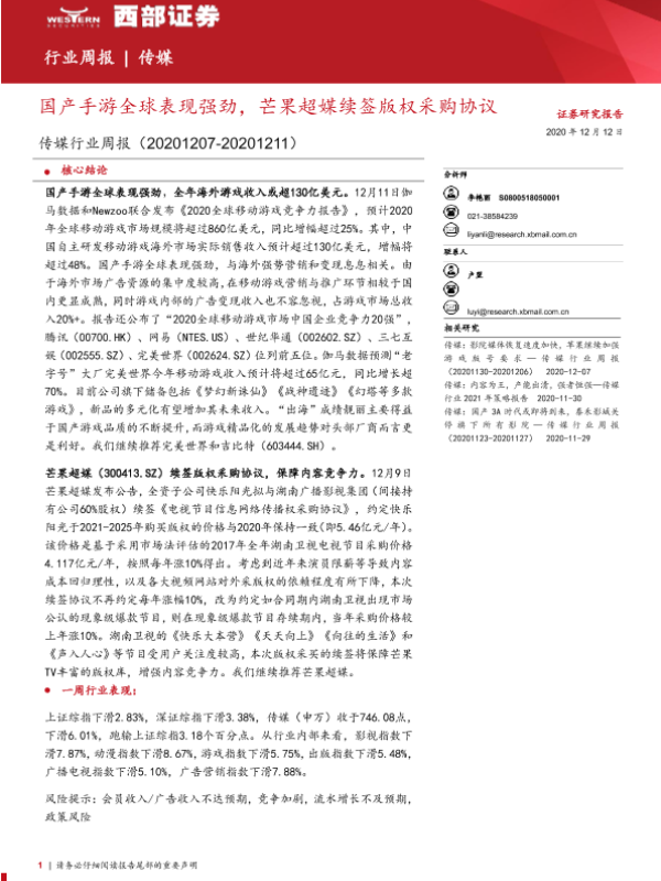 【西部证券】【20201212】20201212-西部证券-传媒行业周报:国产手游全球表现强劲,芒果超媒续签版权采购协议-14页 行业研究