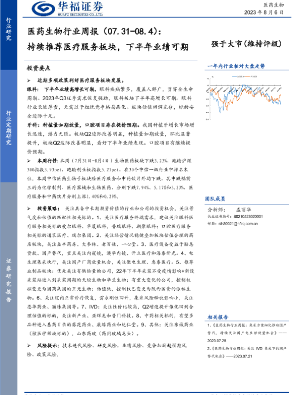 【华福证券】【20230806】医药生物行业周报:持续推荐医疗服务板块,下半年业绩可期-16页 行业研究