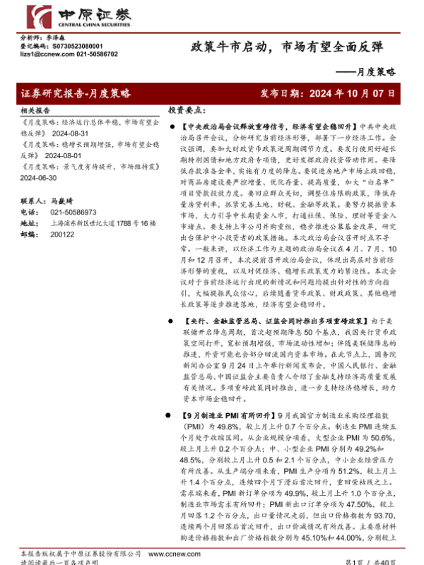 【中原证券】【20241007】月度策略:政策牛市启动,市场有望全面反弹-40页 宏观策略