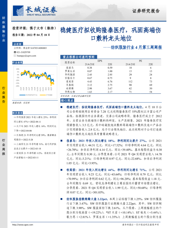 【长城证券】【20220418】20220418-长城证券-纺织服装行业4月第三周周报:稳健医疗拟收购隆泰医疗,巩固高端伤口敷料龙头地位-13页 行业研究