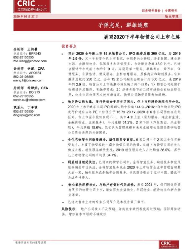 【克而瑞证券】【20200827】展望2020下半年物管公司上市之路:子弹充足,群雄逐鹿-5页 行业研究