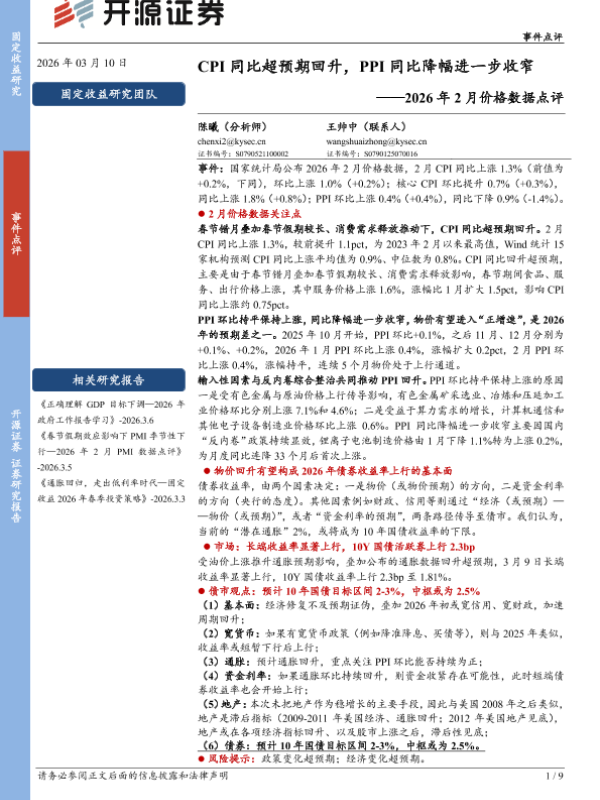 【开源证券】【202603】2026年2月价格数据点评:CPI同比超预期回升,PPI同比降幅进一步收窄-9页 证券期货研究报告