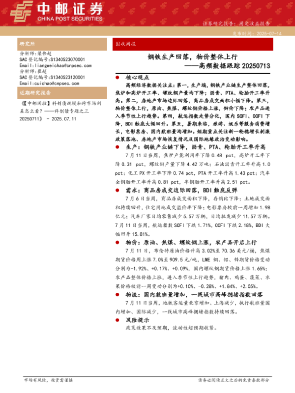 【中邮证券】【20250714】高频数据跟踪:钢铁生产回落,物价整体上行-13页 证券期货研究报告