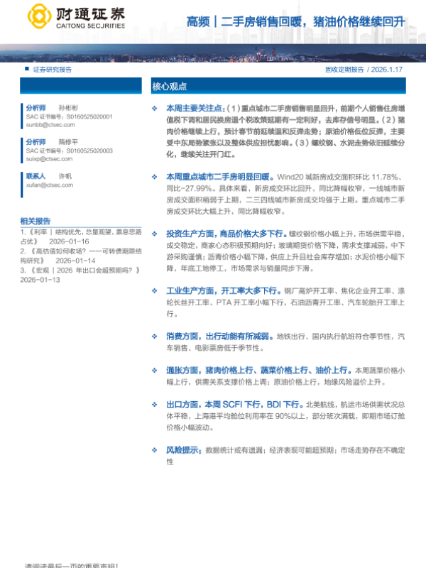 【财通证券】【202601】高频|二手房销售回暖,猪油价格继续回升-14页 证券期货研究报告