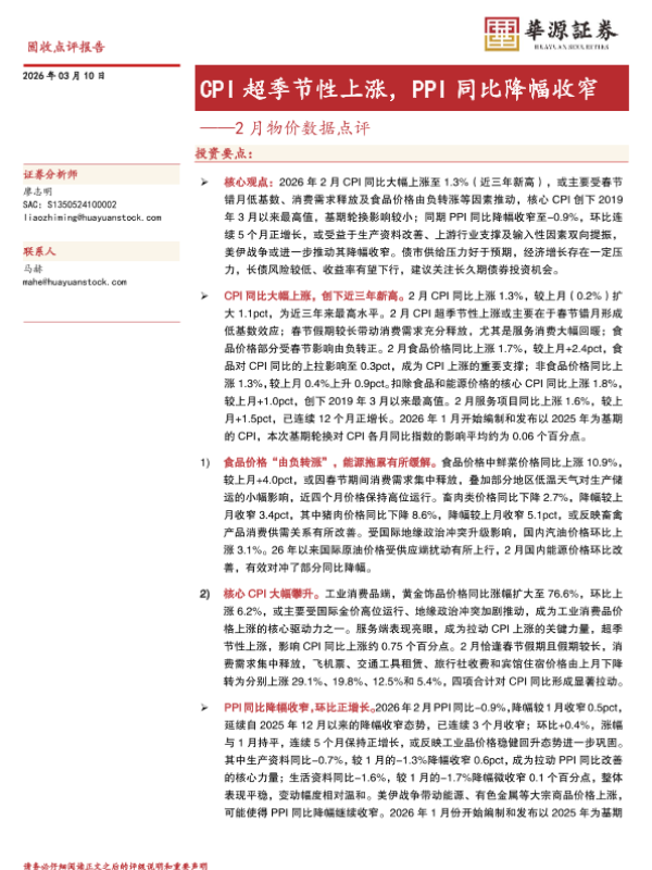 【华源证券】【202603】CP I超季节性上涨,PP I同比降幅收窄——2月物价数据点评-6页 证券期货研究报告