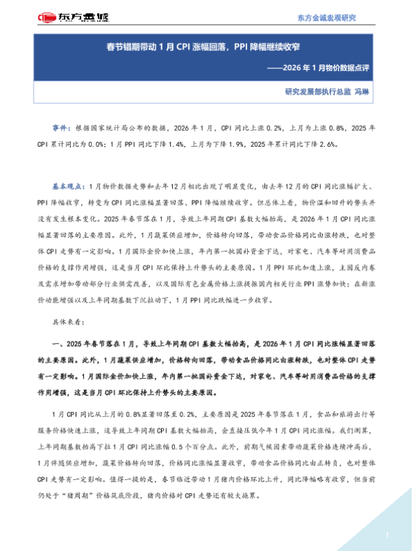 【东方金诚】【202601】2026年 1月物价数据点评——春节错期带动 1月 CPI涨幅回落,PPI降幅继续收窄-3页 宏观策略