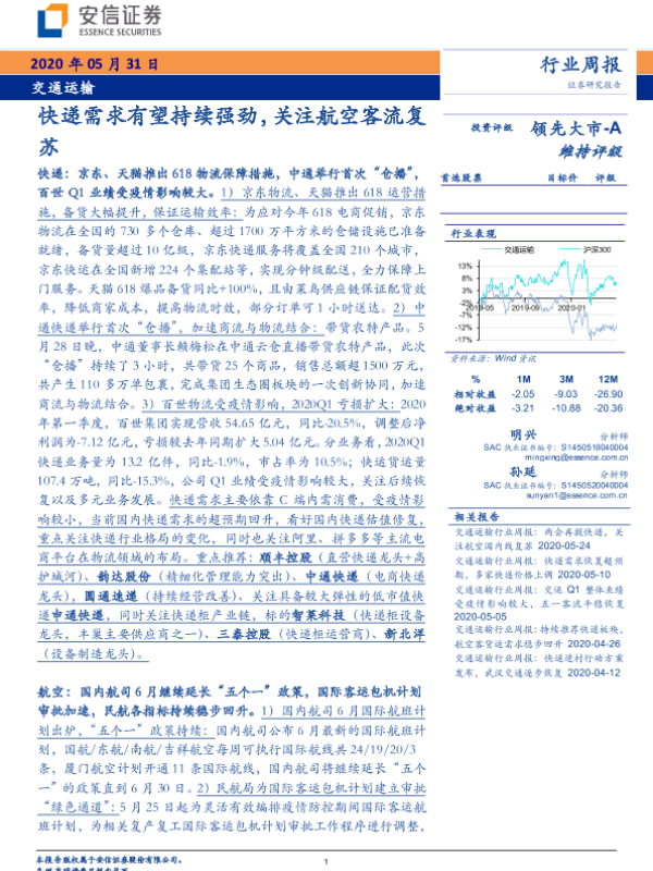 【安信证券】【20200531】交通运输行业周报:快递需求有望持续强劲,关注航空客流复苏-20页 行业研究