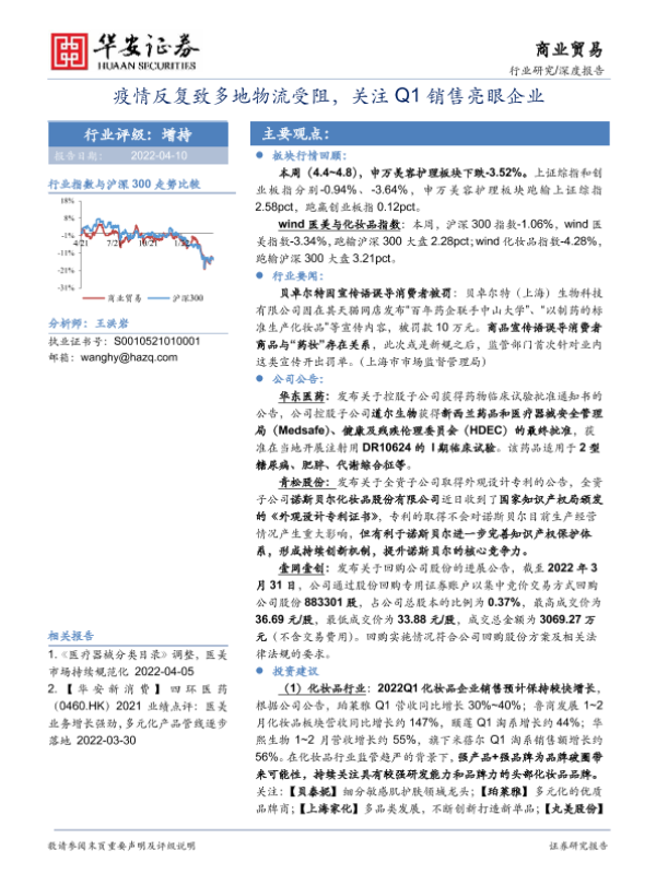【华安证券】【20220410】商业贸易行业:疫情反复致多地物流受阻,关注Q1销售亮眼企业-18页 行业研究