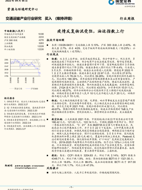 【国金证券】【20220405】交通运输产业行业研究:疫情反复物流受阻,油运指数上行-14页 行业研究
