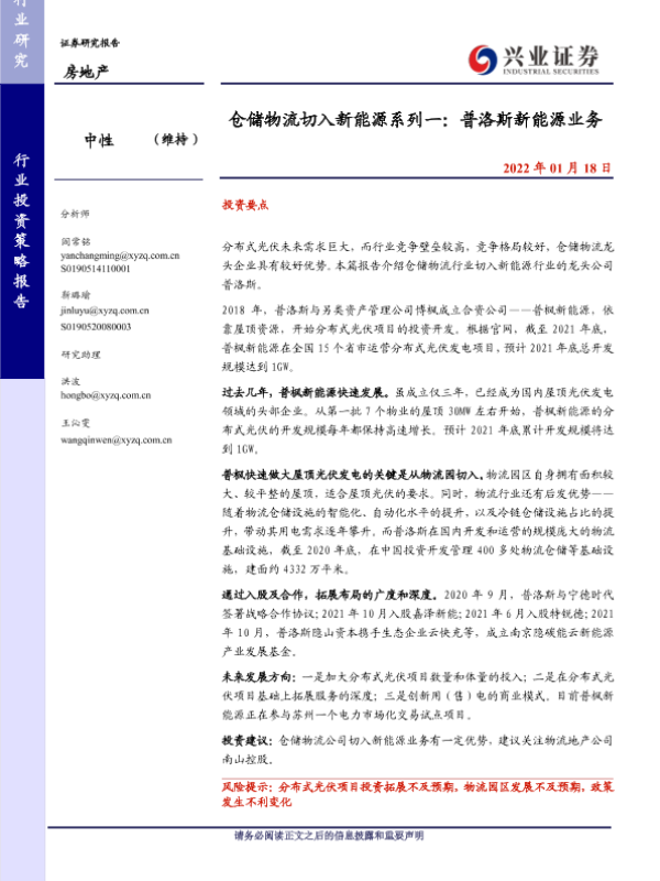 【兴业证券】【20220118】仓储物流切入新能源系列一:普洛斯新能源业务-6页 行业研究