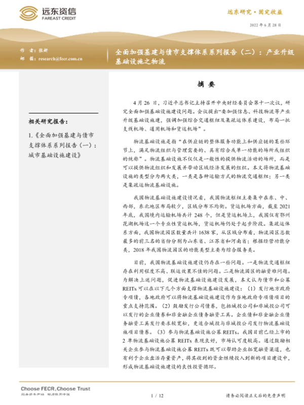 【远东资信】【20220628】全面加强基建与债市支撑体系系列报告(二):产业升级基础设施之物流-12页 行业研究