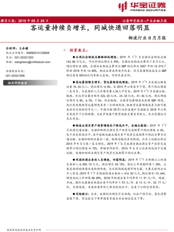 【华宝证券】【20190829】物流行业8月月报:客运量持续负增长,同城快递回落明显-17页 行业研究
