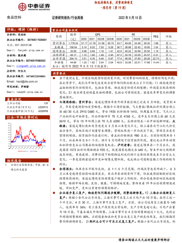 【中泰证券】【20220515】食品饮料周思考(第19周):物流持续改善,消费逐渐修复-9页 行业研究