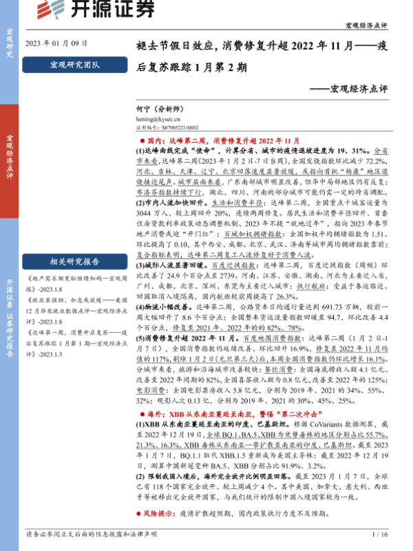 【开源证券】【20230109】宏观经济点评:疫后复苏跟踪1月第2期-褪去节假日效应,消费修复升超2022年11月-16页 行业研究