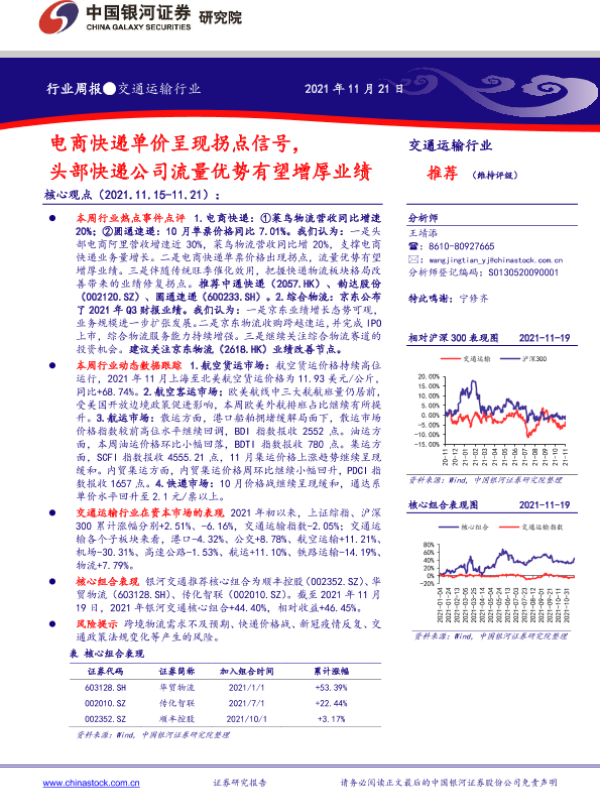 【银河证券】【20211121】电商快递单价呈现拐点信号,头部快递公司流量优势有望增厚业绩-27页 行业研究