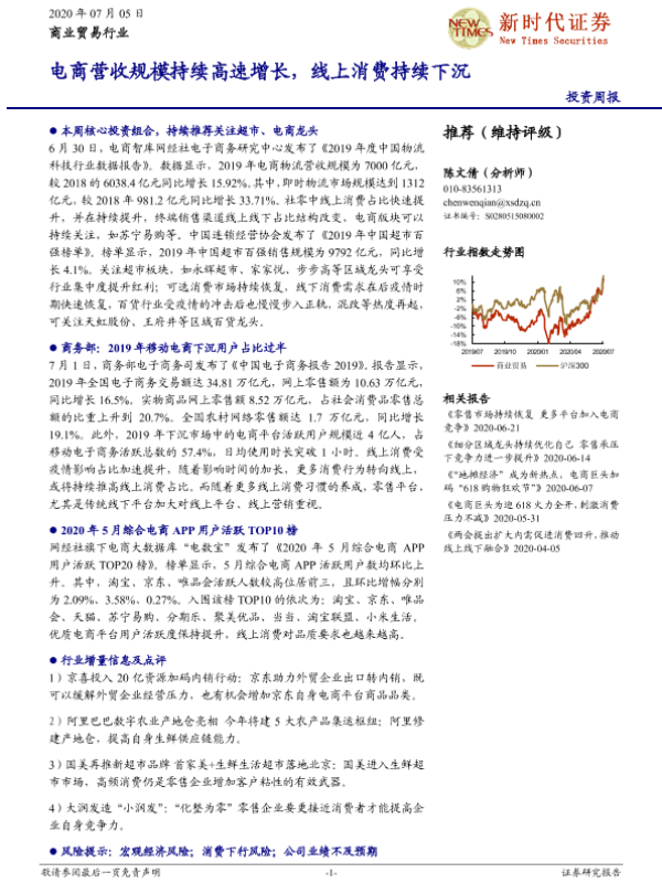 【新时代证券】【20200705】商业贸易行业投资周报:电商营收规模持续高速增长,线上消费持续下沉-12页 行业研究