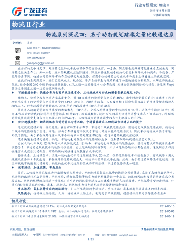 【广发证券】【20190808】物流系列深度四:基于动态规划建模定量比较通达系-21页 行业研究