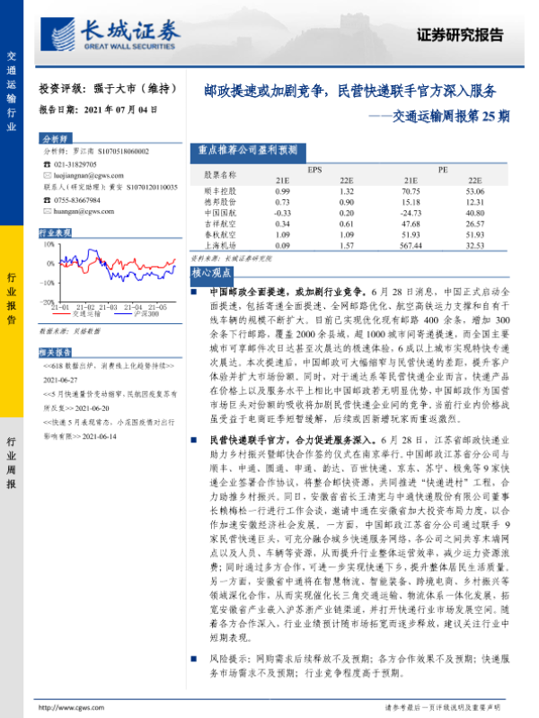 【长城证券】【20210704】邮政提速或加剧竞争,民营快递联手官方深入服务-22页 行业研究