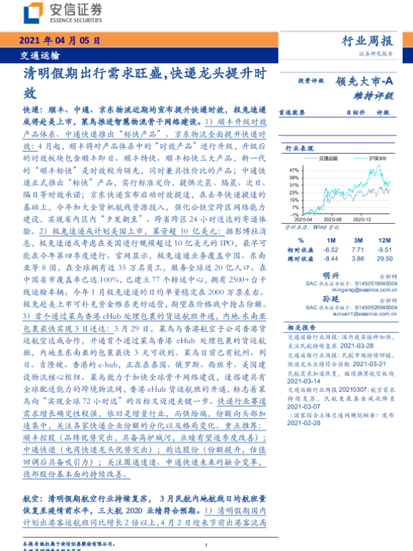 【安信证券】【20210405】交通运输行业周报:清明假期出行需求旺盛,快递龙头提升时效-19页 行业研究