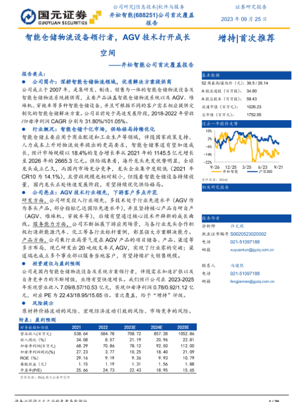 【国元证券】【20230925】井松智能公司首次覆盖报告:智能仓储物流设备领行者,AGV技术打开成长空间-30页 行业研究