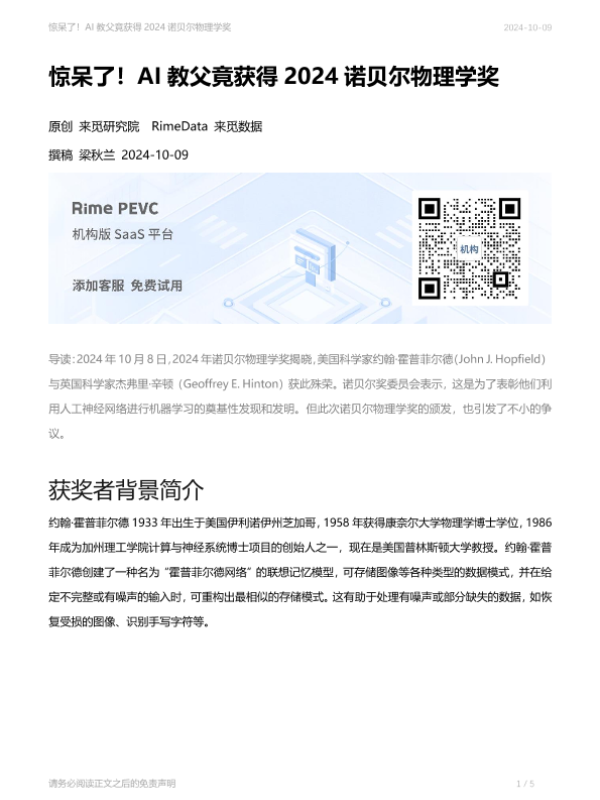 【来觅研究院】【20241009】AI:惊呆了!AI教父竟获得2024诺贝尔物理学奖-5页 行业研究