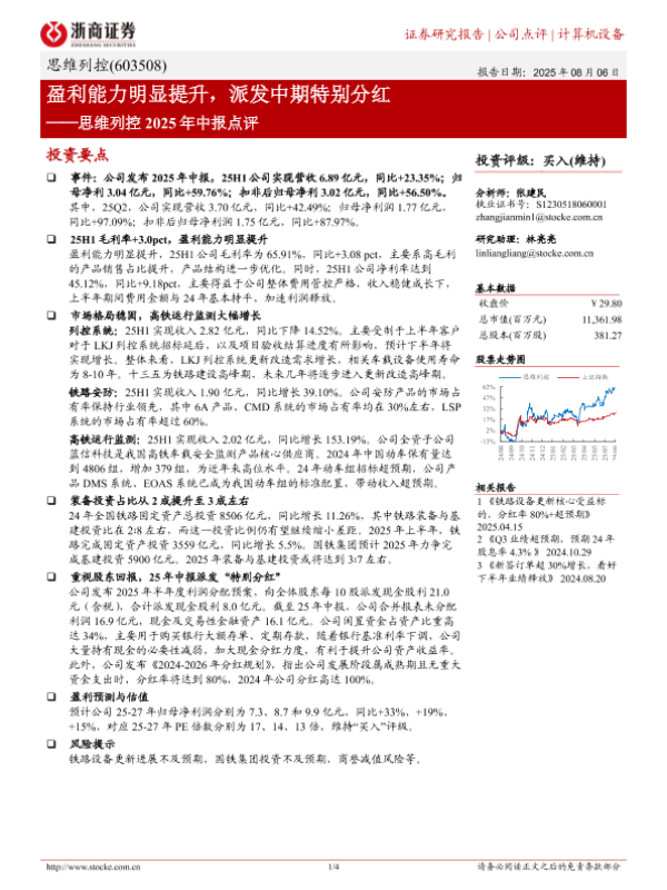 【浙商证券】【20250806】思维列控2025年中报点评:盈利能力明显提升,派发中期特别分红-4页 证券期货研究报告