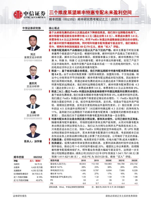 【中信证券】【20200701】三个维度展望顺丰特惠专配未来盈利空间-20页 行业研究