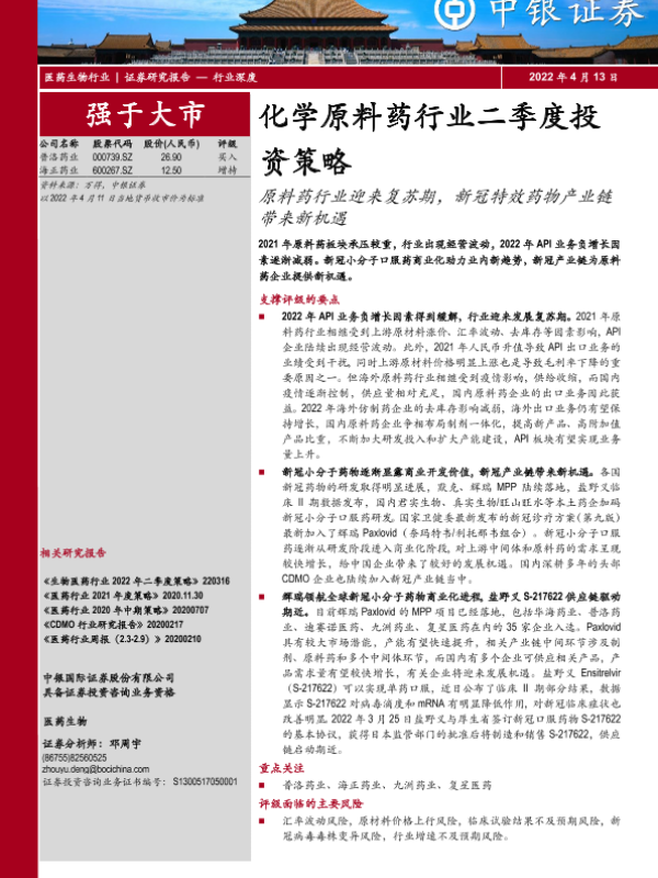 【中银证券】【20220413】化学原料药行业二季度投资策略:原料药行业迎来复苏期,新冠特效药物产业链带来新机遇-22页 行业研究