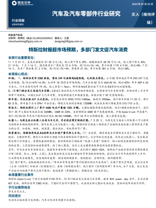 【国金证券】【20230723】汽车及汽车零部件行业研究:特斯拉财报超市场预期,多部门发文促汽车消费-14页 行业研究