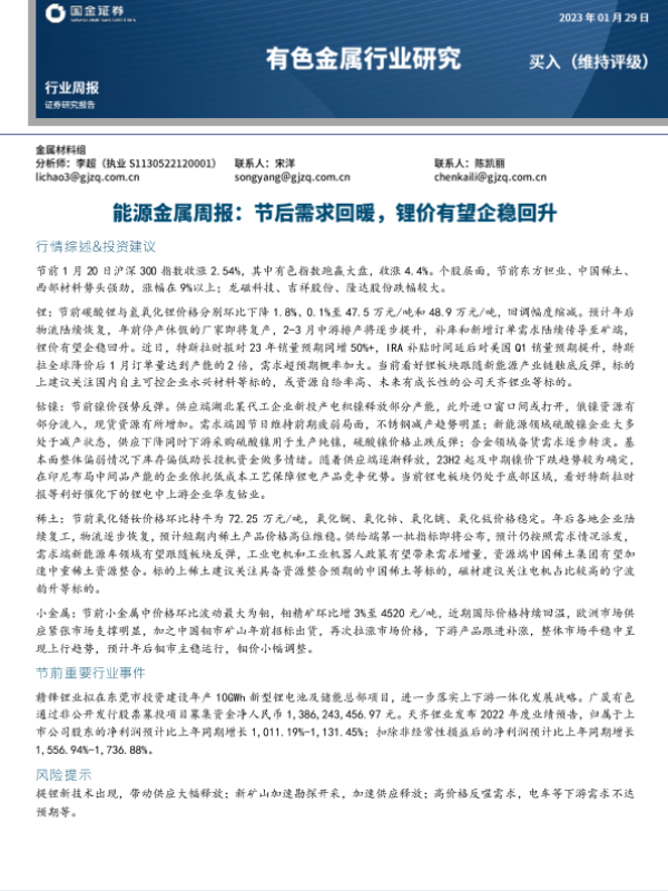 【国金证券】【20230129】20230129-国金证券-能源金属周报:节后需求回暖,锂价有望企稳回升-15页 行业研究