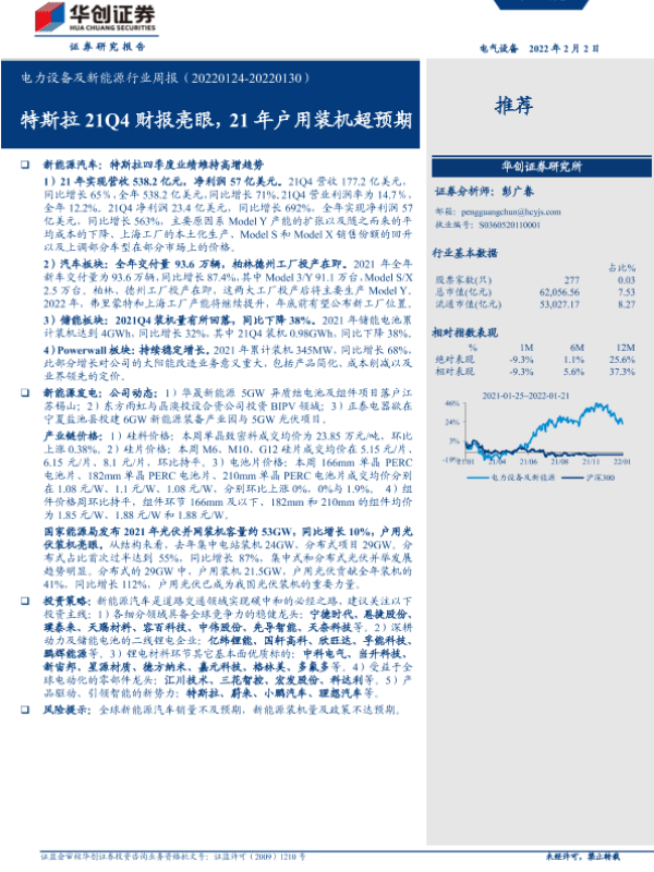 【华创证券】【20220202】电力设备及新能源行业周报:特斯拉21Q4财报亮眼,21年户用装机超预期-23页 行业研究