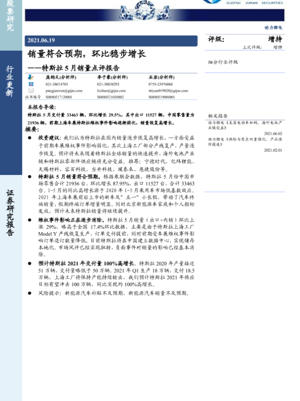 【国泰君安证券】【20210619】销量符合预期,环比稳步增长——特斯拉5月销量点评报告-2页 行业研究