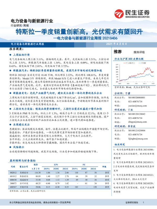 【民生证券】【20210406】20210406-民生证券-电力设备与新能源行业周报:特斯拉一季度销量创新高,光伏需求有望回升-17页 行业研究