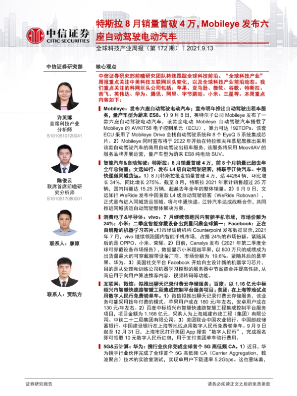 【中信证券】【20210913】20210913-中信证券-全球科技产业周报(第172期):特斯拉8月销量首破4万,Mobileye发布六座自动驾驶电动汽车-13页 行业研究