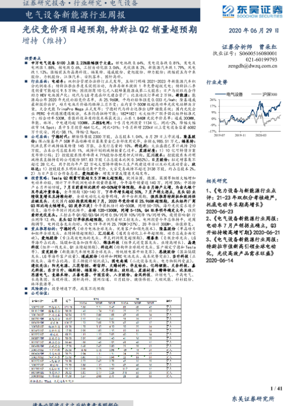 【东吴证券】【20200629】电气设备新能源行业周报:光伏竞价项目超预期,特斯拉Q2销量超预期-41页 行业研究