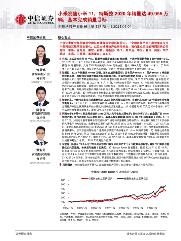 【中信证券】【20210104】20210104-中信证券-全球科技产业周报(第137期):小米发售小米11,特斯拉2020年销量达49.955万辆,基本完成销量目标-17页 行业研究