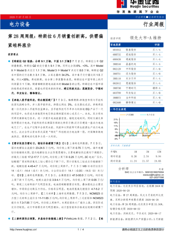 【华金证券】【20200705】电力设备第28周周报:特斯拉6月销量创新高,供需偏紧硅料涨价-4页 行业研究